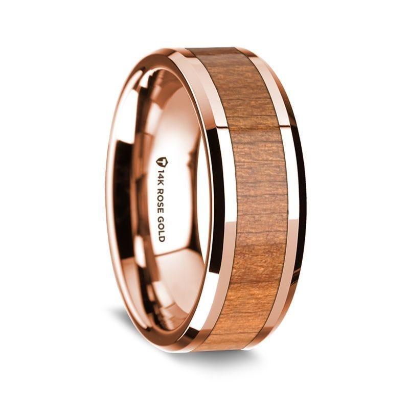 14K Rose Gold Polished Beveled Edges Wedding Ring with Cherry Wood Inlay - 8 mm