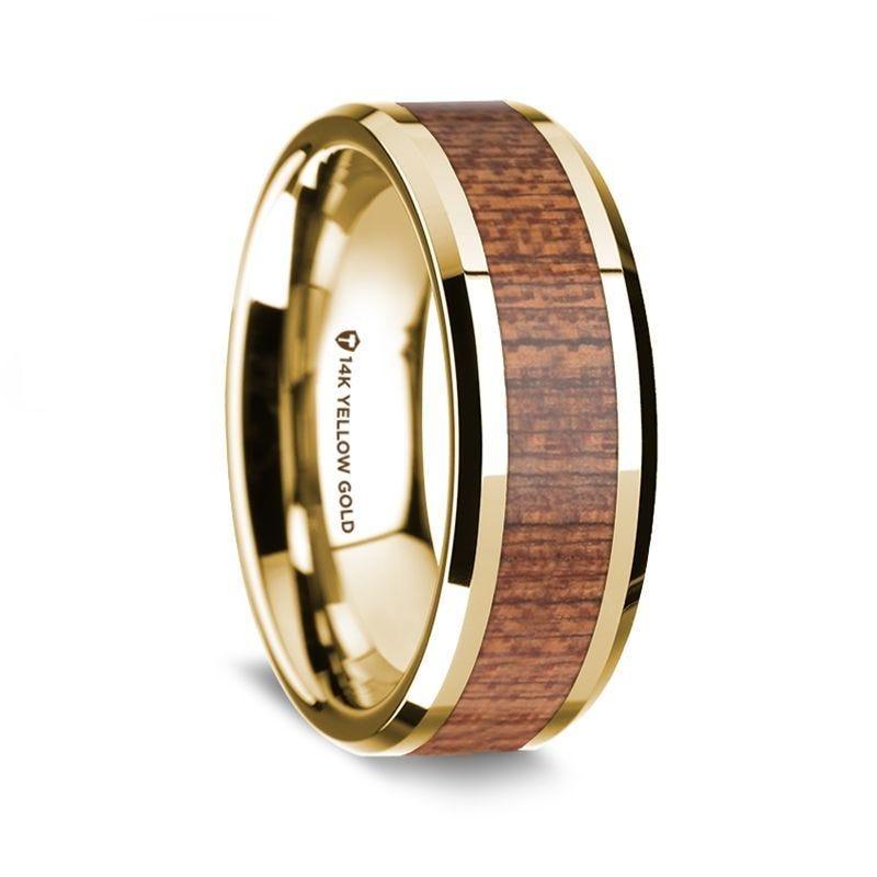 14K Yellow Gold Polished Beveled Edges Men's Wedding Band with Cherry Wood Inlay - 8 mm