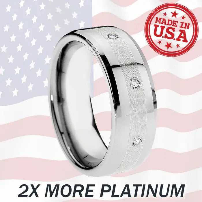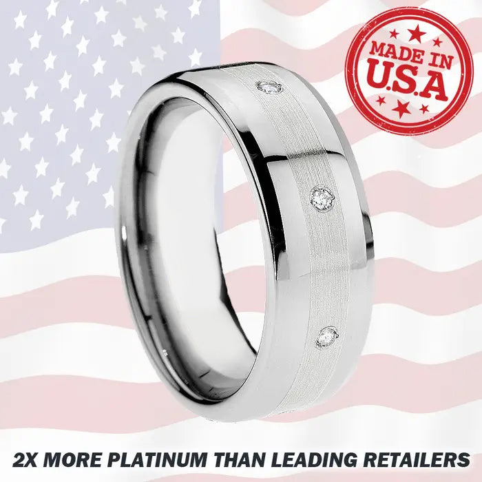 Our Finest Ring: When you have tungsten, 950 platinum and 8 diamonds in one ring, you know you've got a top of the line wedding band. Inlaid with a 3mm platinum inlay and 8 round diamonds of .04 ct each (.32 tctw), this high polished beveled tungsten ring is the height of luxury coupled with the functionality of durable tungsten carbide. You won't find a better wedding band anywhere.