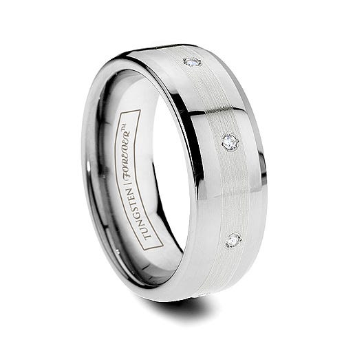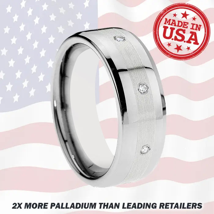 PLEASE NOTE: Our Finest ring just got a bit more affordable: A new edition to our tungsten diamond rings line, the Legacy uses Platnium's big brother Palladium as the inlay to step in and cover for him. Palladium looks identical to platinum and is also considered "highly precious." This tungsten ring features 8 brilliant round cut 12 point ctw (0.12 ct) diamonds set into a Palladium inlay and mounted on a high polished beveled ring. This Tungsten Forever tungsten diamond ring is manufactured with precision for a classic work of art. Made in America. A new addition to our tungsten diamond rings line, the Legacy uses Platnium's little brother Palladium as the inlay to step in and cover for him. Lifetime Sizing, Lifetime Warranty