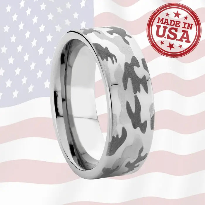 A pipe-cut version of our popular STRYKER men's camo tungsten ring. Available in 6mm and 8mm width, these camo rings are perfect for the serviceman or women in your life and are also popular with hunters and outdoorsmen.