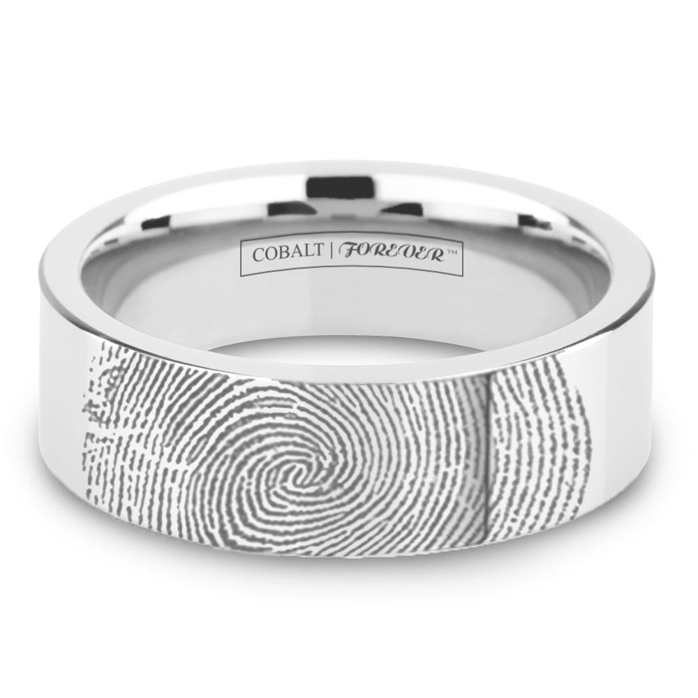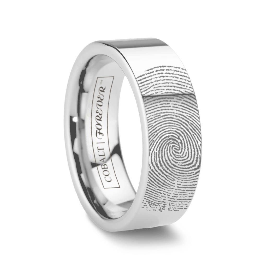 A truly one-of-a-kind custom ring at an amazing price! Our FINGER PRINT ring made from high quality cobalt chrome features the unique contours of you or your loved one's fingerprint precisely engraved using our laser engraving machine. Keep a bit of your partner on you at all times by adding their fingerprint to this high polished pipe-cut tungsten ring.