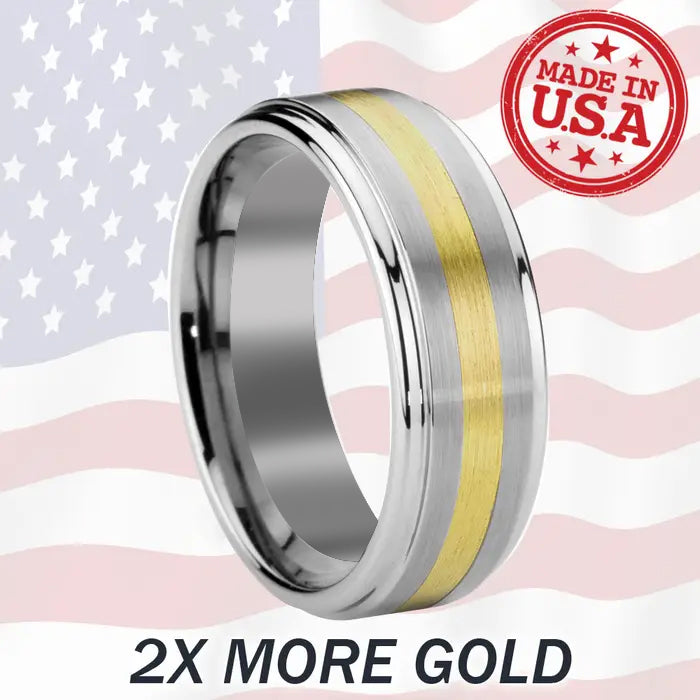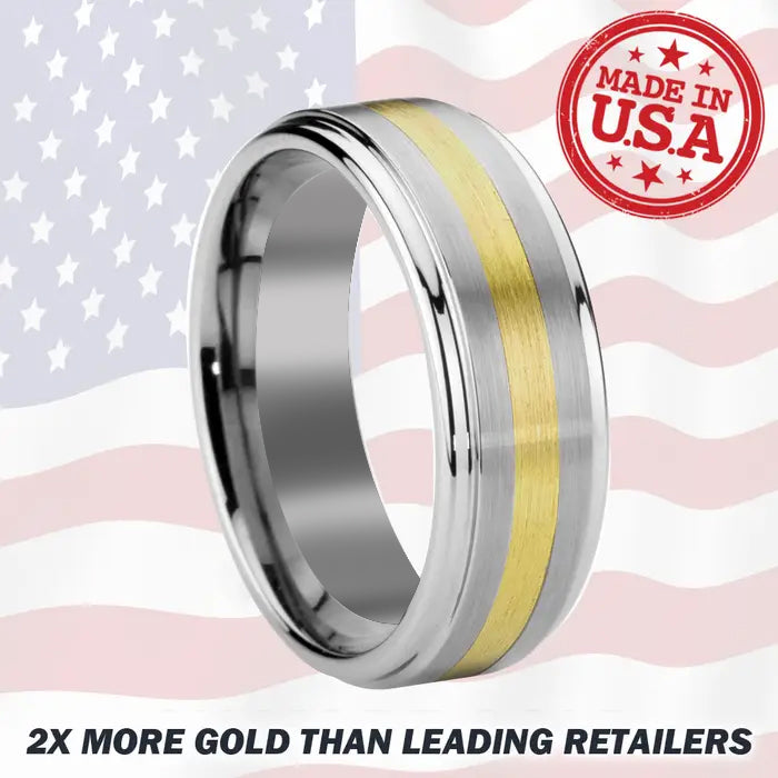 Solid 18k gold wraps its way around this heavy duty tungsten carbide ring. Unlike most other inlay rings, the Tungsten Forever SATURN is brushed on the top for those who are looking for subtle perfection. Polished step edges add even more design and character to complement the piece. The gold inlay is an industry high 0.7mm deep for long lasting inset strength, durability, and maximum value.