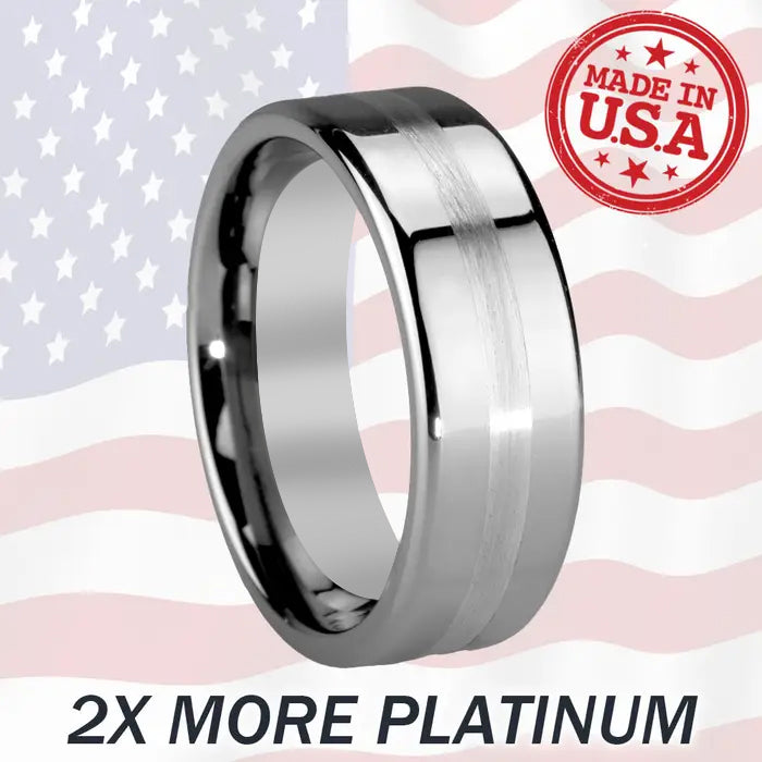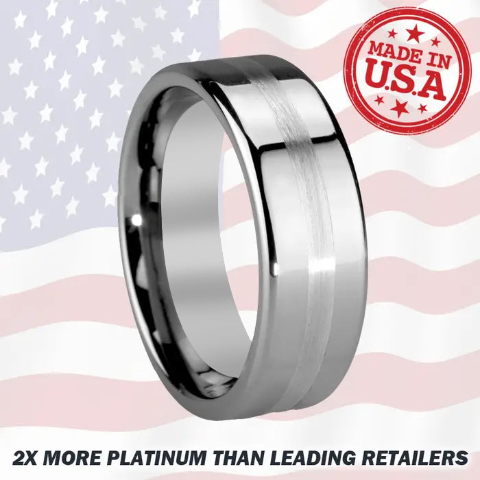 This ZEUS tungsten wedding band has an inlay of 950 pure platinum on a highly polished flat surface. Combining the toughness of tungsten with precious platinum, an immaculate marriage of two metals is sealed. This is the ultimate wedding band. Lifetime Sizing & Lifetime Warranty!
