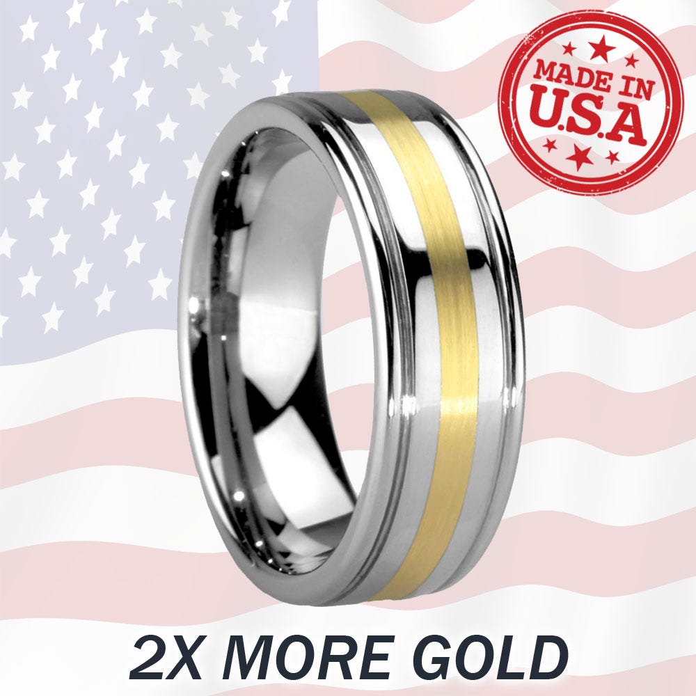 Gold is one of the oldest precious metals known to man, while tungsten has emerged as the strongest wedding band to date. Why not get the best of both worlds? This inlaid CORONADO tungsten carbide wedding band has a polished center with two grooves to simulate a royal crown of traditional 18k yellow gold.