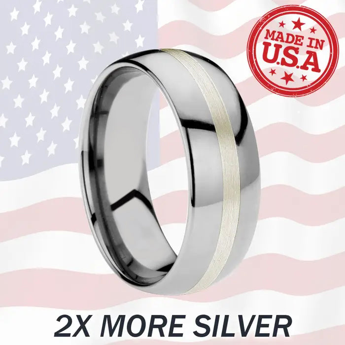A modern domed band with sterling silver inlaid within, the Argon is ruggedly elegant. Classic in shape, form, and structure; everlasting in the nature of the tough material. Empower yourself with this Tungsten Forever band, an excellent choice for any size. The silver inlay is an industry high 0.7mm deep for long lasting strength, durability, and maximum value.