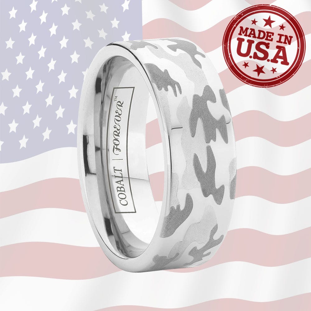 Our laser-engraved camouflage pattern is now available on cobalt chrome rings. Finished with Tungsten World's original camo pattern, this pipe-cut cobalt chrome ring is high polished and available in 6mm and 8mm widths for both men and women. Lifetime Sizing, Lifetime Warranty.