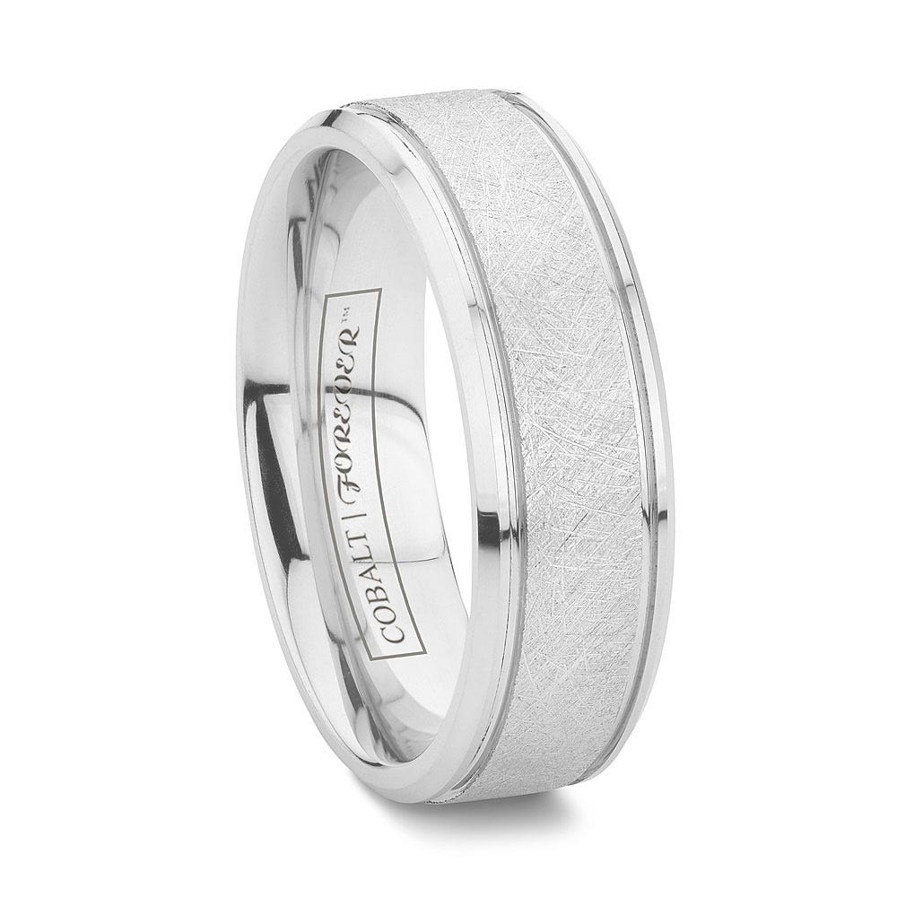 A new take on the brushed finish, it has a raised center with unique scuffed brush finish top. Polished beveled edges round out this "anything but ordinary" style of cobalt chrome wedding ring.