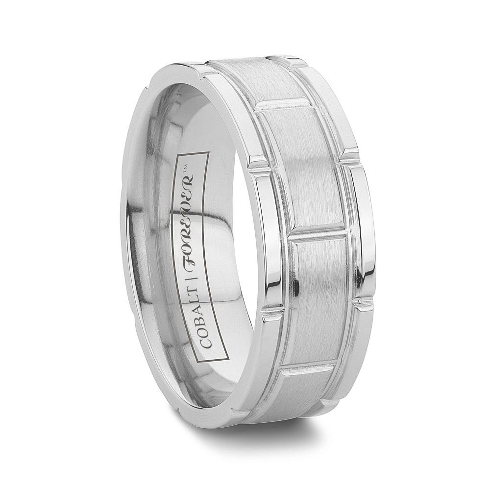 A unique combination of brushed and polished finishes, the durable styling of the STOCKHOLM is bordered by high polished edges. Complete with a milled center section and a center brush stripe, the STOCKHOLM is durable and one of the more rugged looking Cobalt wedding bands.