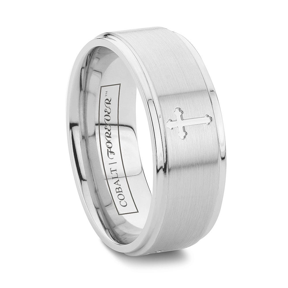NOEL is a unique religious cobalt chrome cross ring featuring prominently showcased crosses deeply etched into the raised center of this cobalt chrome ring. Each cross is expertly engraved directly into the cobalt and highlighted by the surrounding brushed finish of the ring. The NOEL'S lower edges flank the brushed top nicely with their high polished finish and comfortably smooth edges.