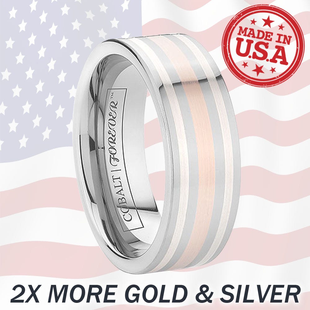 Not your average inlay wedding band, the TROKIA features 3 inlays on the same band! Pipe-cut cobalt chrome is inlaid with two 1mm wide Argentium silver inlays flanking the wider rose gold inlay. To finish the seamless look, a micro-brushed finish is applied over the top of the precious metal inlays to complete its alternating appearance. Prefer platinum instead of rose gold? White gold instead of silver? Give us a call for pricing on customized inlays.
