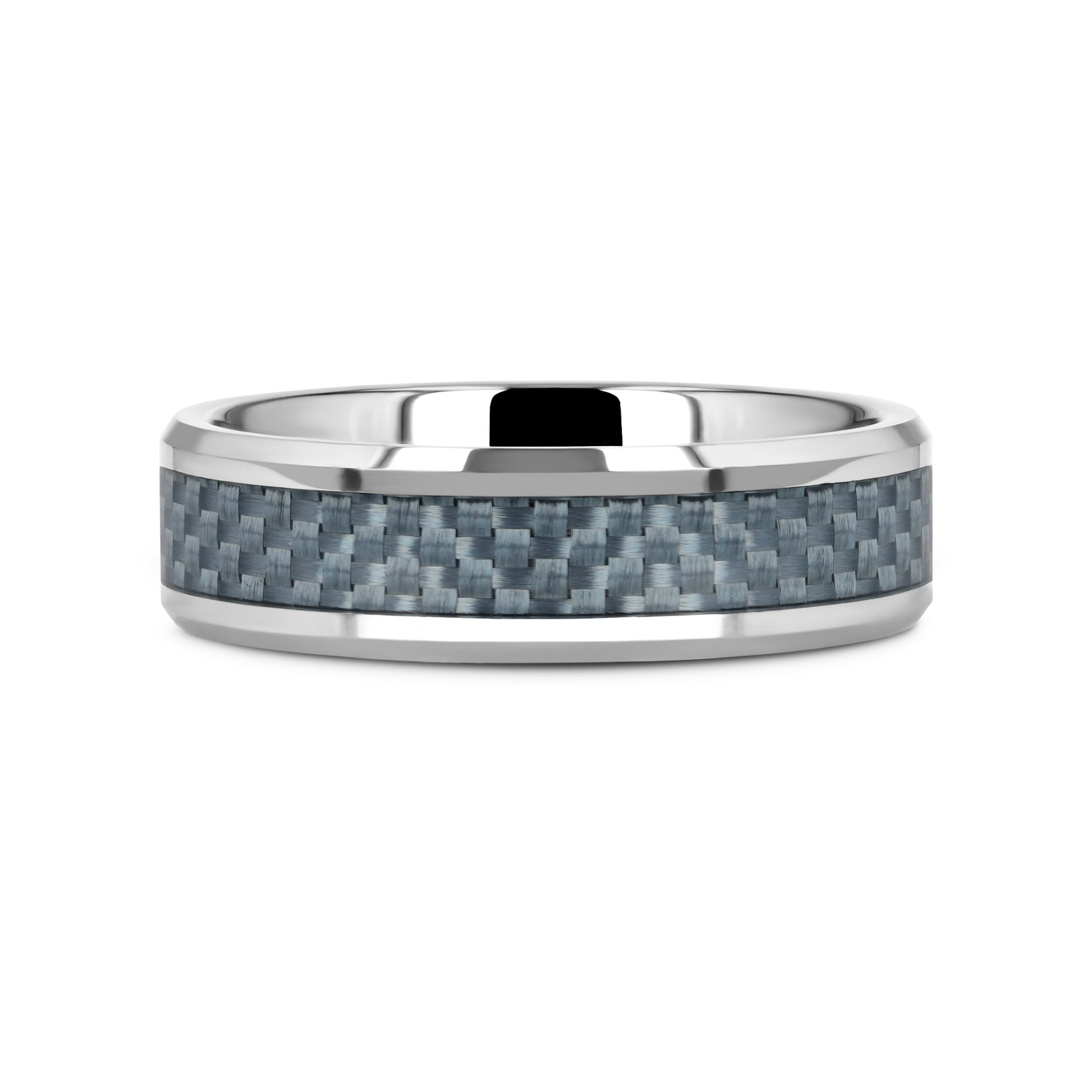This bold and durable flat-profile Tungsten Carbide wedding band design by Thorsten features polished beveled edges and a premium light blue Carbon Fiber inlay.