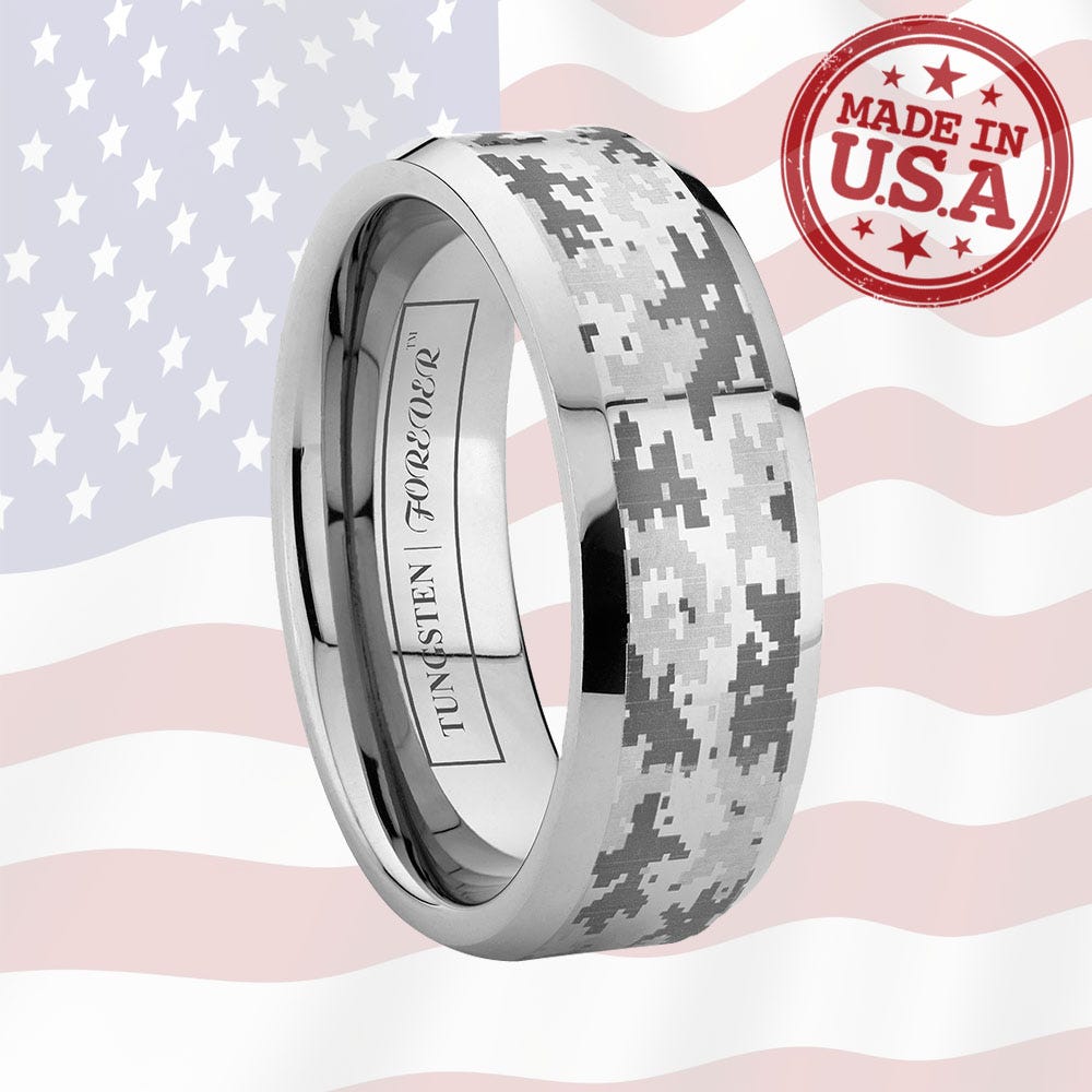 Featuring our exclusive digital camo pattern, the ARMANDO is the lastest in hi-tech wedding rings. Made from durable tungsten carbide and complete with precise polished beveled edges, this digital camo ring is completed with its pattern engraved on the flat center section. Ready to ship in 1 business day, you can choose from 6mm or 8mm width for your wedding band or gift to the military man or hunter in your life.
