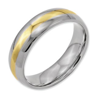 Lustrous titanium is accented beautifully by 14k yellow gold in this domed titanium wedding band. The WELLINGTON is fully high polished and its lightweight and sleek contours give it an ease of wear unsurpassed by similar rings. Available in 6mm and 8mm widths.
