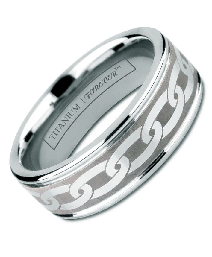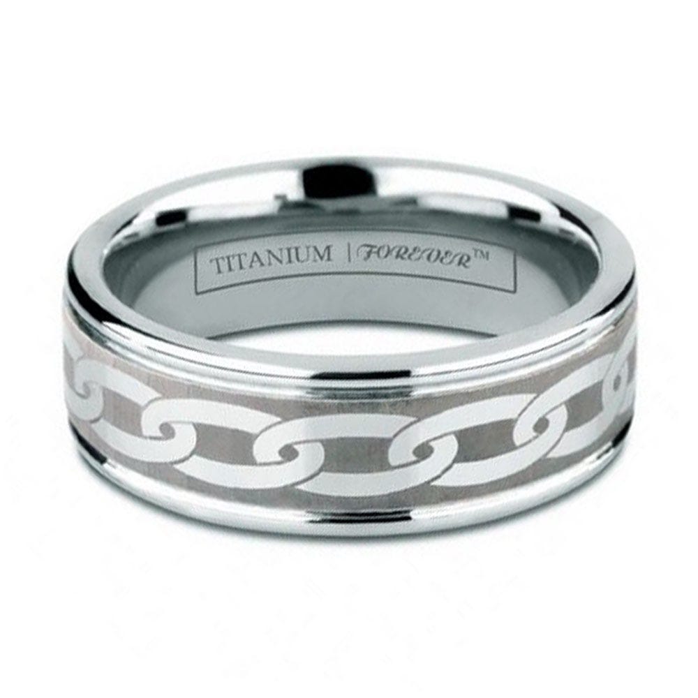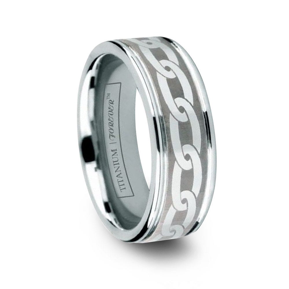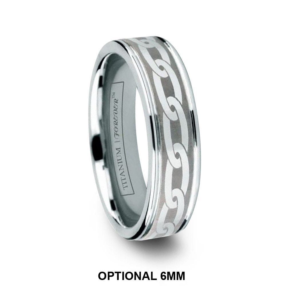 You're only as strong as your weakest link.... Good thing this metal chain inspired laser engraved men's titanium wedding band has no weak links! Made from the highest quality titanium, the SPLICE features strength on strength with its rugged chain design. Available in 6mm or 8mm width choices and engraved using our high tech laser engraving machine, whether you're a biker, motorcycle enthusiast or just love tough rings, this is the band for you.