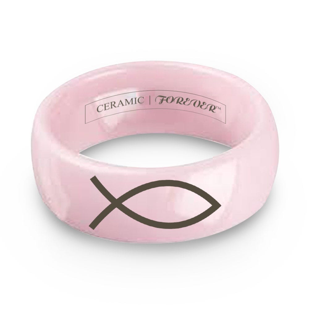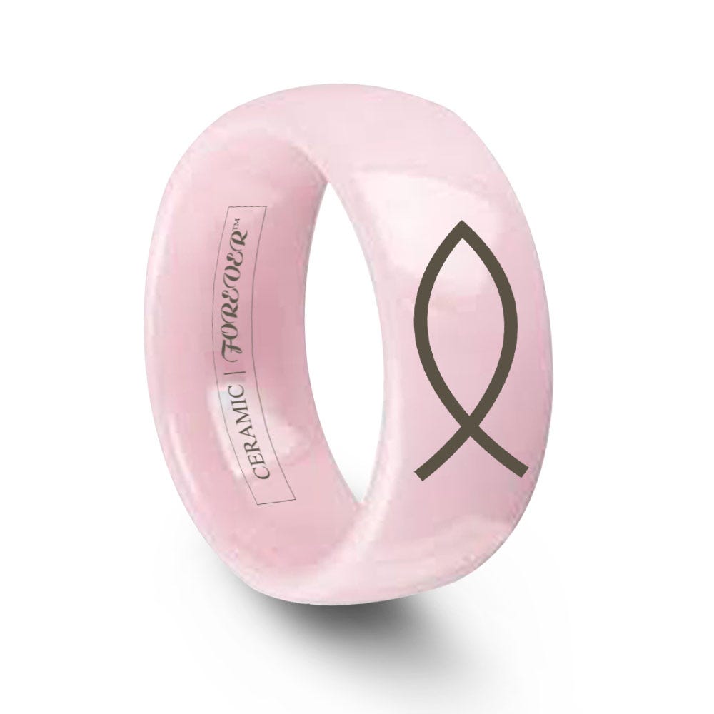 Once an ancient secret symbol, the Ichthys or "Jesus Fish" remains synonymous with Christianity even in the modern age. Our pink ceramic DEVOUT ring in 8mm prominently displays the popular symbol on a high polished fashionable ring. Lightweight and pink all the way through, ceramic rings are the best material for colored bands because the color never fades. Wear this ring everyday or even just on special occasions and it will always look great!