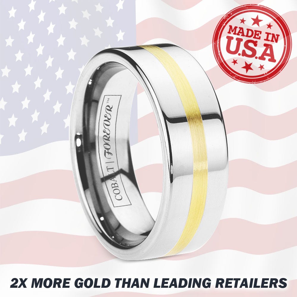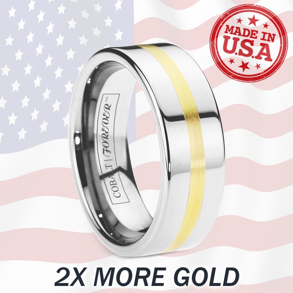 A new classic in the making. The LEO is a traditional pipe -cut men's cobalt chrome ring with the added style of a 18k gold inlay. Each deep inlay channel goes beyond industry standard for the most amount of precious metal in each cobalt band. Like all our cobalt rings, the LEO is impervious to cracks and chips and is shatterproof.