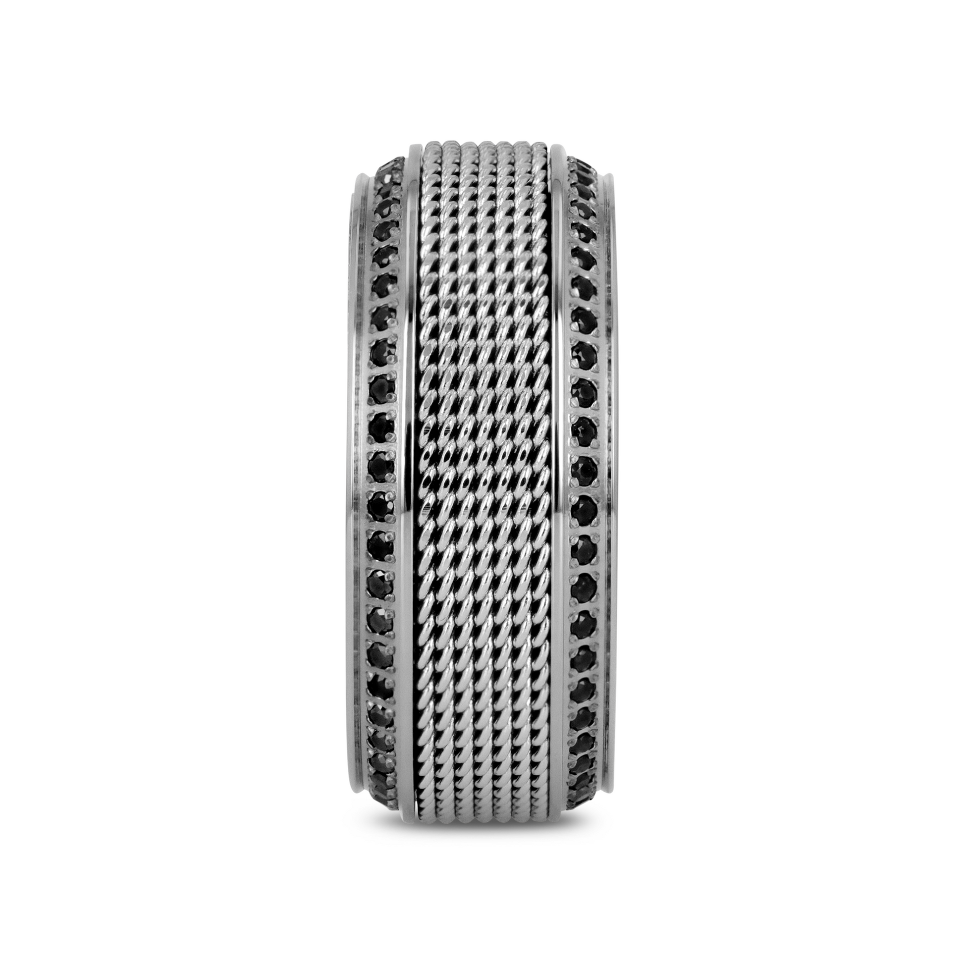 GAUNTLET Steel Chain Titanium Wedding Ring Polished Beveled Edges Set with Round Black Diamonds - 10mm