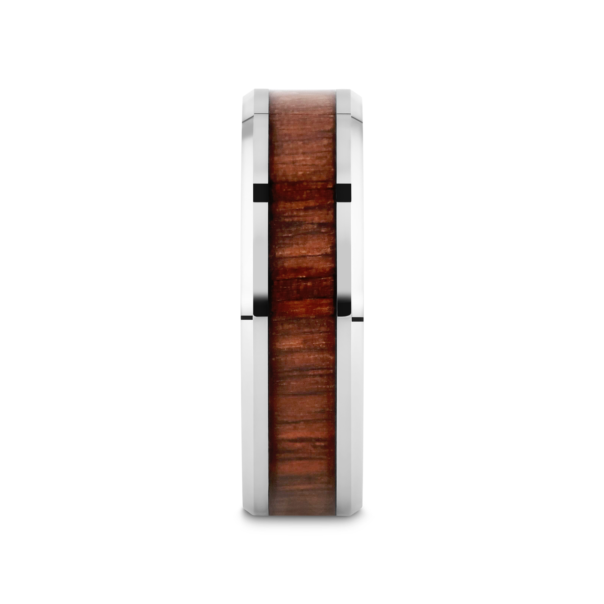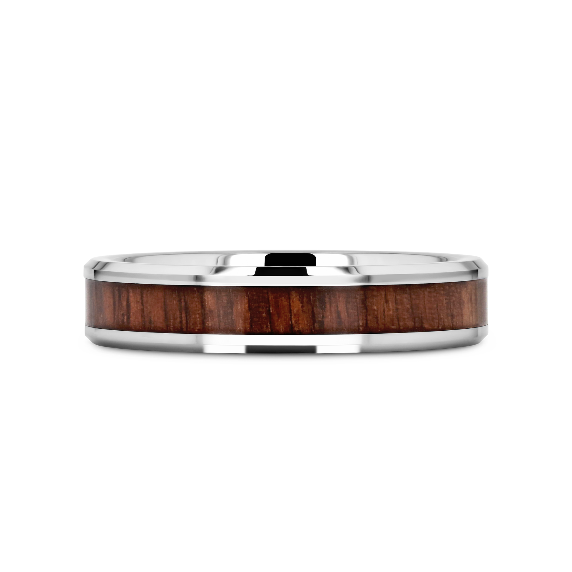 A beautiful wood grain pattern of the real Black Walnut wood inlay is at the center of this unique men’s wedding band by Thorsten. Its flat profile is set off by polished beveled Tungsten Carbide edges.