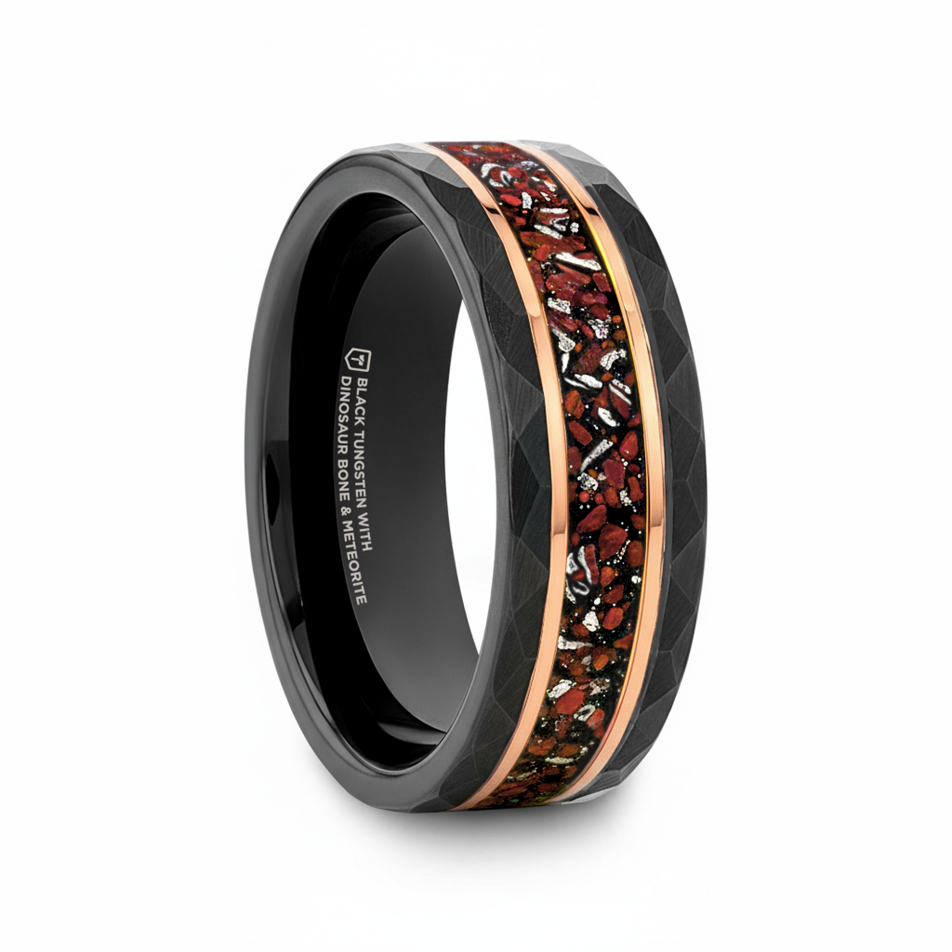 INFERNO Black/Rose Hammered Tungsten Carbide Ring with Dinosaur Bones and Meteorite - 8mm