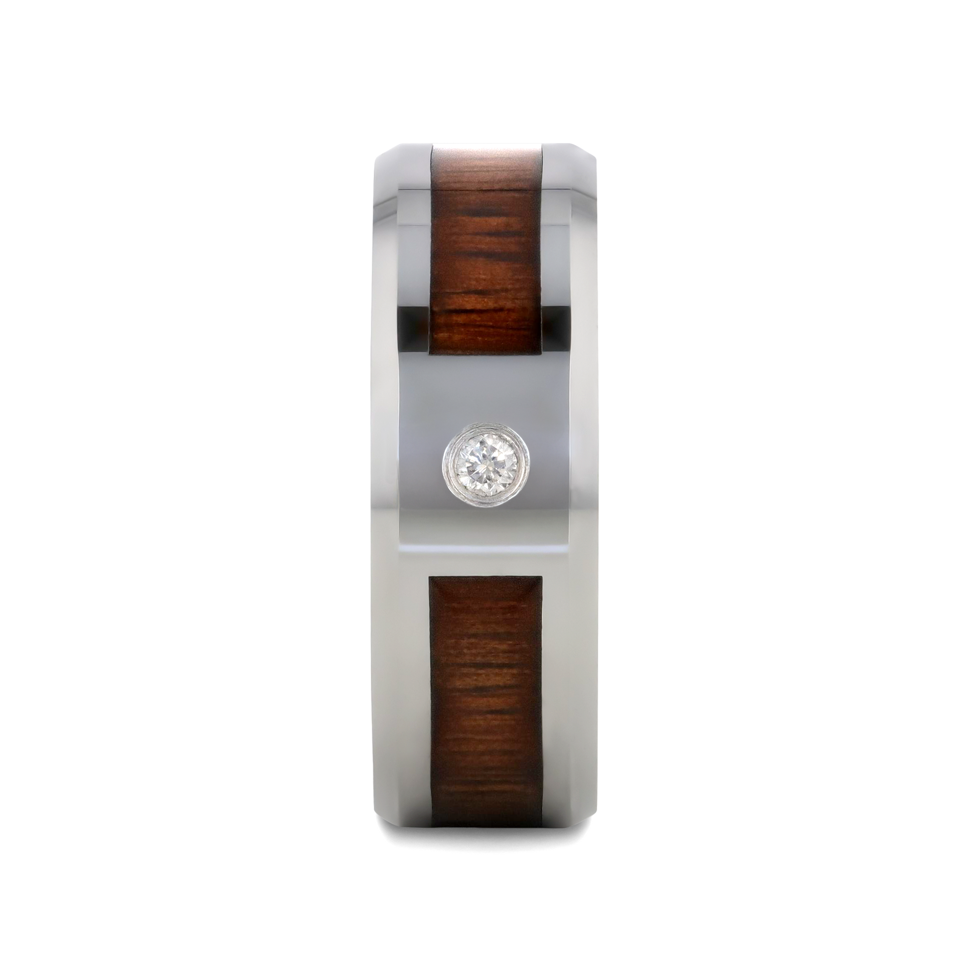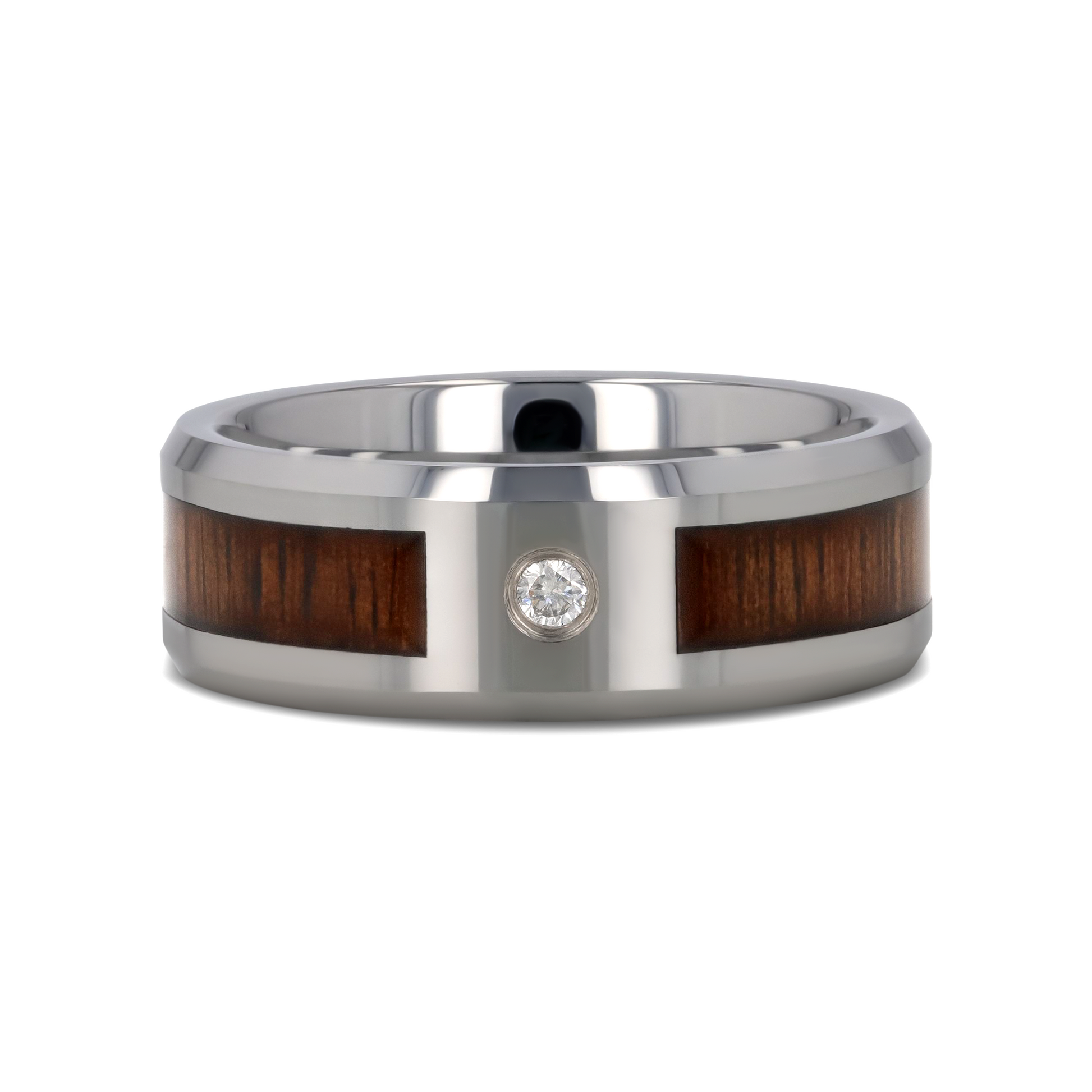 This sophisticated Tungsten Carbide ring by Thorsten features polished beveled edges that accentuate the rare 100% authentic Hawaiian Koa wood. A 0.06 ct white round cut diamond boldly set in the center of the ring completes this captivating wood inlay wedding band.