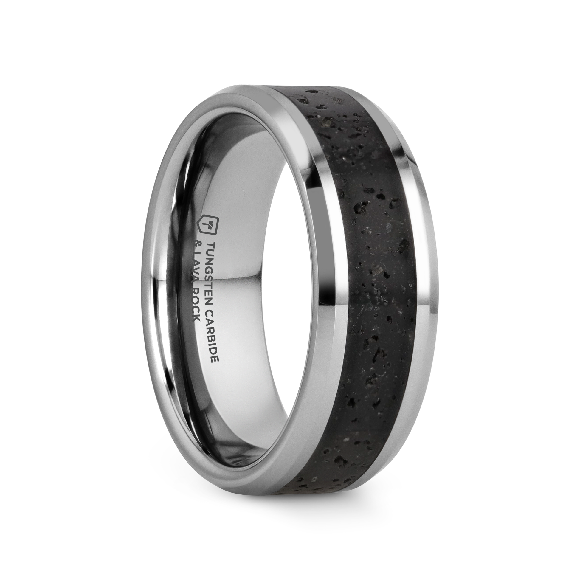 KILAUEA Men’s Polished Tungsten Wedding Band with Black & Gray Lava Rock Stone Inlay & Polished Beveled Edges - 8mm