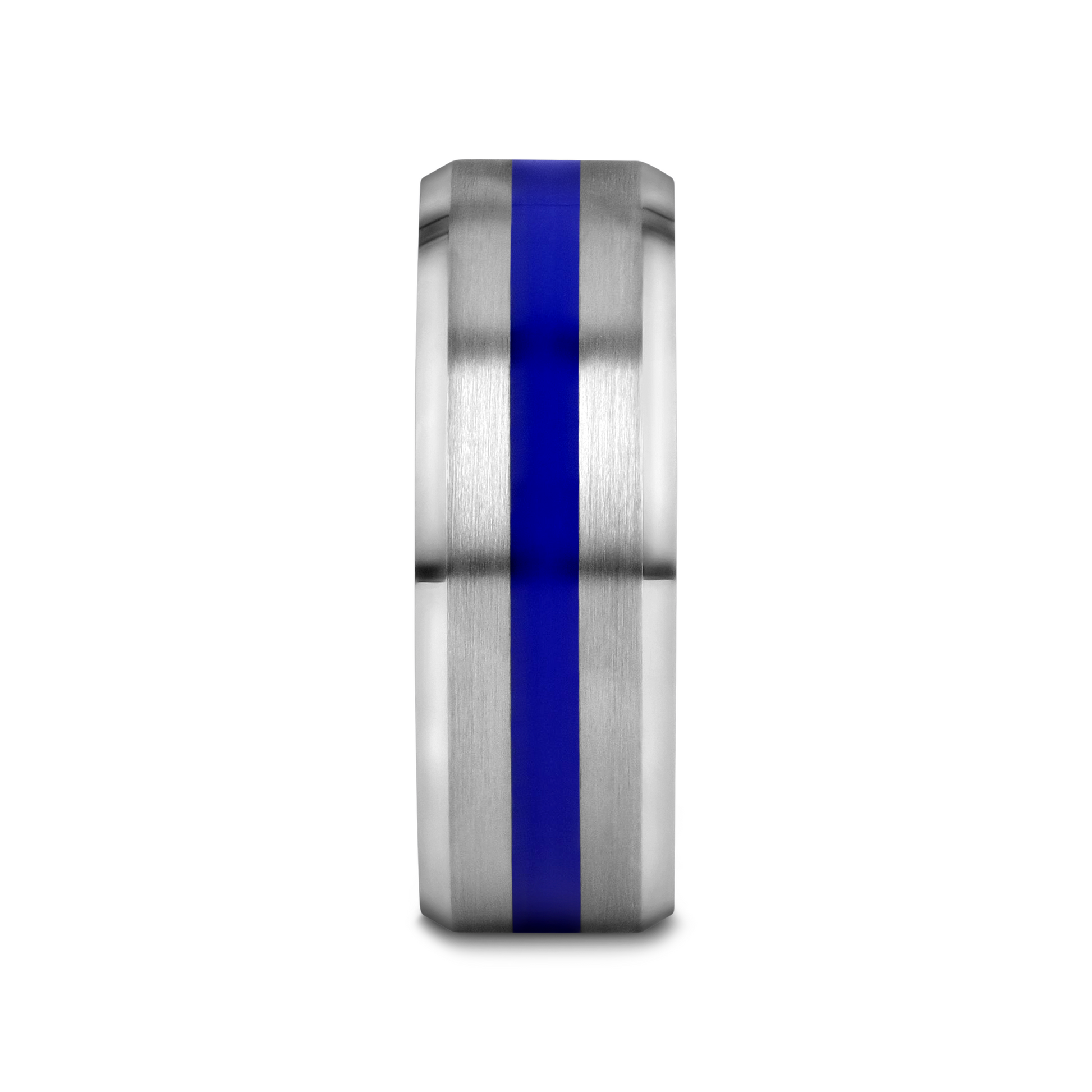 LAWSON Men’s Beveled Edges White Tungsten Brushed Finish Wedding Ring with Blue Stripe - 8mm