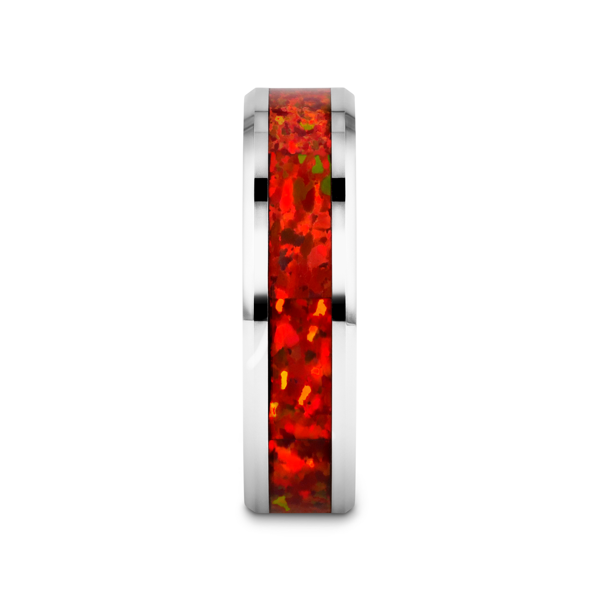 NEBULA Tungsten Wedding Band with Beveled Edges and Red Opal Inlay - 4mm - 8mm