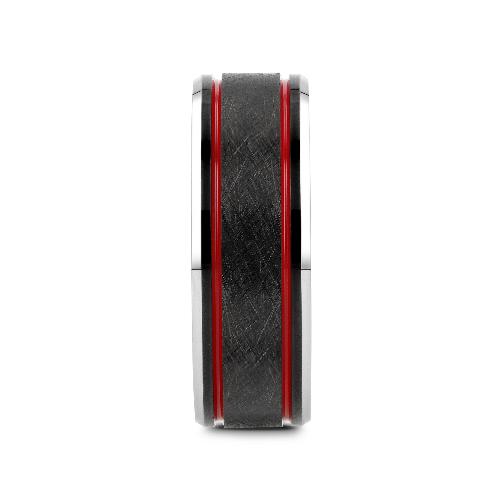 - A dark Tungsten band with a double red stripe, wire finish, and polished beveled edges.