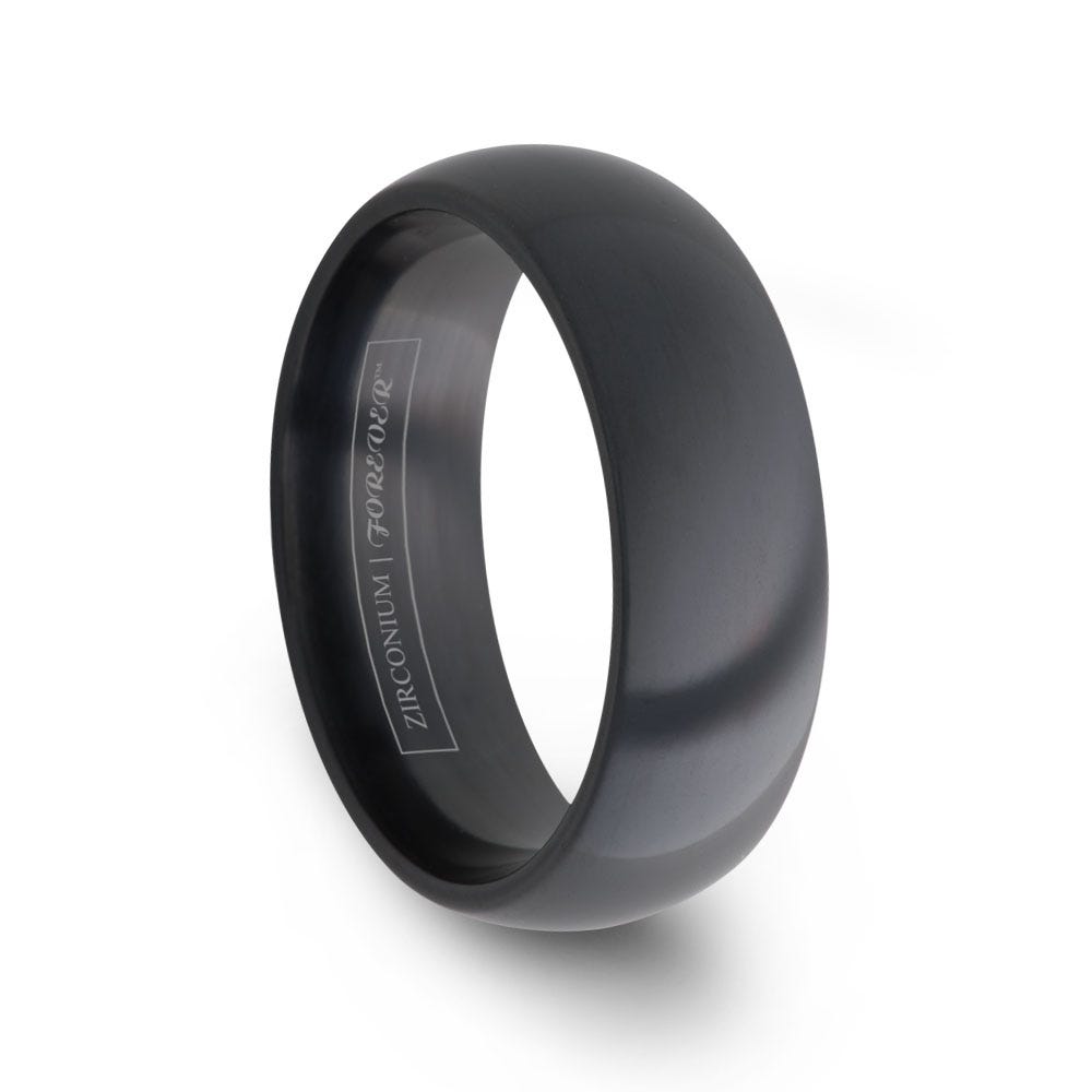 A do it all black ring, the JETTA is both a slick casual black zirconium ring and customizable black wedding band. The durable black finish is added via a heat treatment process giving the JETTA a unique black finish that can be customized with precious metal inlays or diamond settings. Available in 6mm or 8mm width.