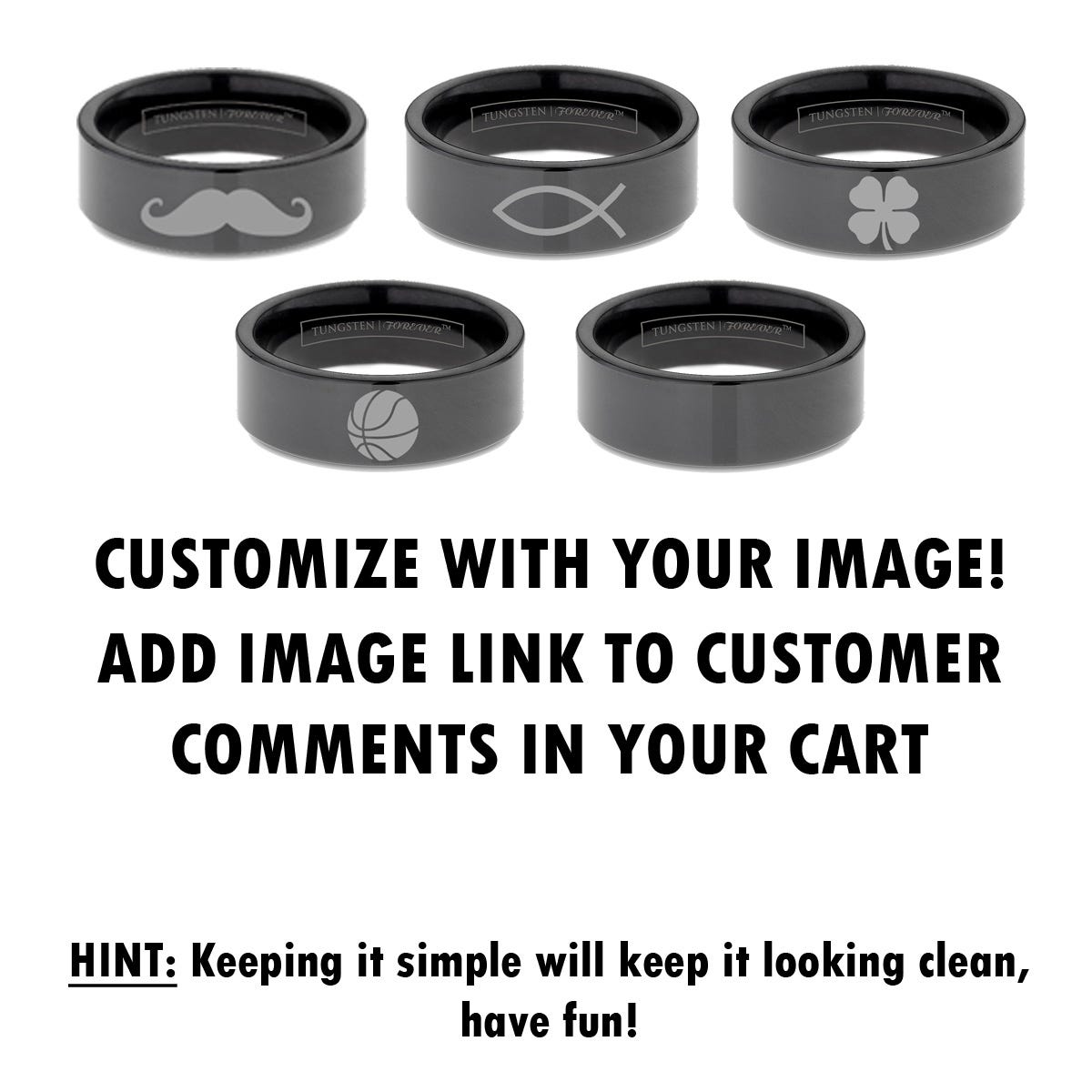 Are you a fanatic? Only dress in your teams colors? Or just want a unique black tungsten band with your custom engraving at an amazing price?! This ring is for you. Choose from our selection of sports and team themed engravings for this pipe-cut black tungsten band. Or even send us a link to the image of your choice for engraving.