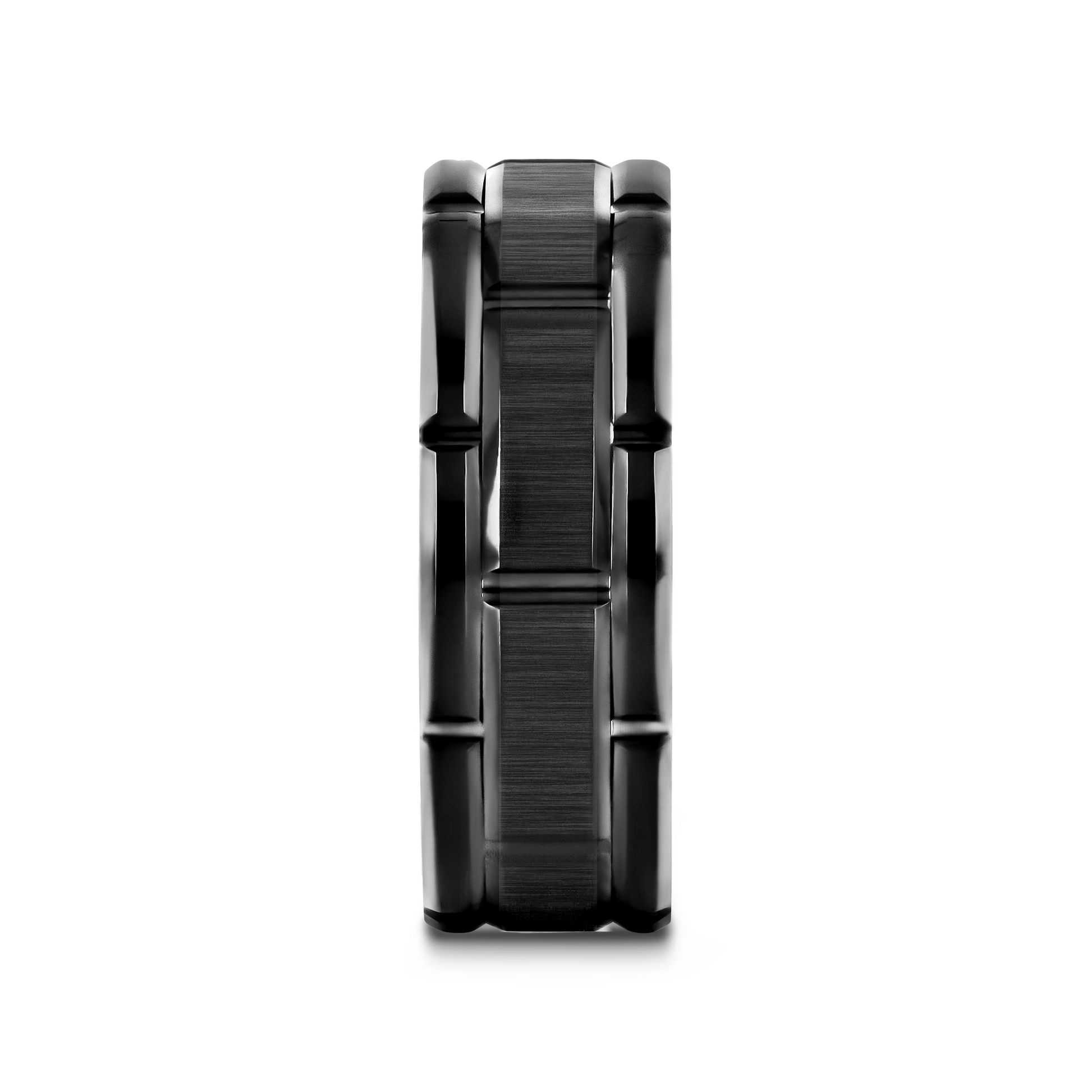 This remarkable, attention-grabbing Black Tungsten Carbide ring design from Thorsten features a beautiful vertically-brushed finish on the center band flanked with carved side band segments with polished beveled edges and can be worn as a wedding band or promise ring.